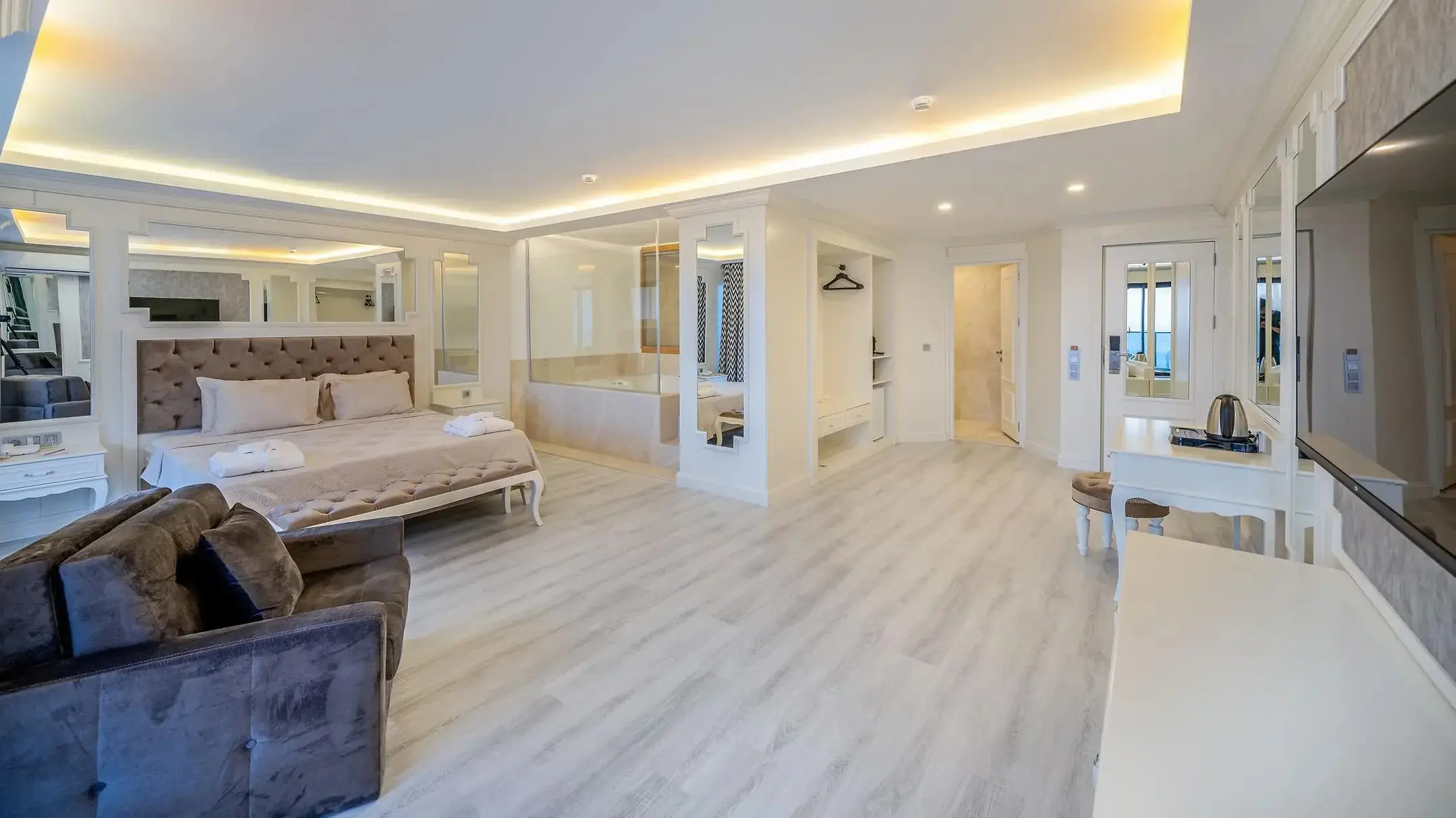 The suite features one double bed and a sofa bed. Amenities include split air conditioning, satellite TV, LCD TV, complimentary Wi-Fi, minibar, direct dial telephone, key card security system, WC, shower, hairdryer, make-up mirror, in-room safe, fire alarm, kettle, and balcony. Flooring is a combination of wood parquet and ceramic tiles.